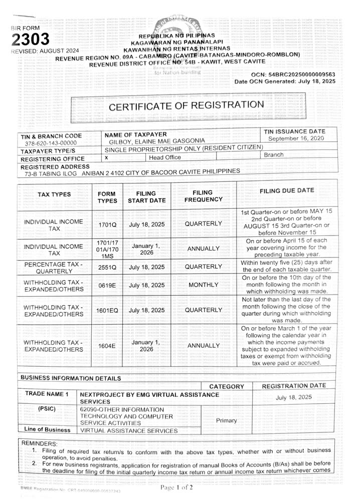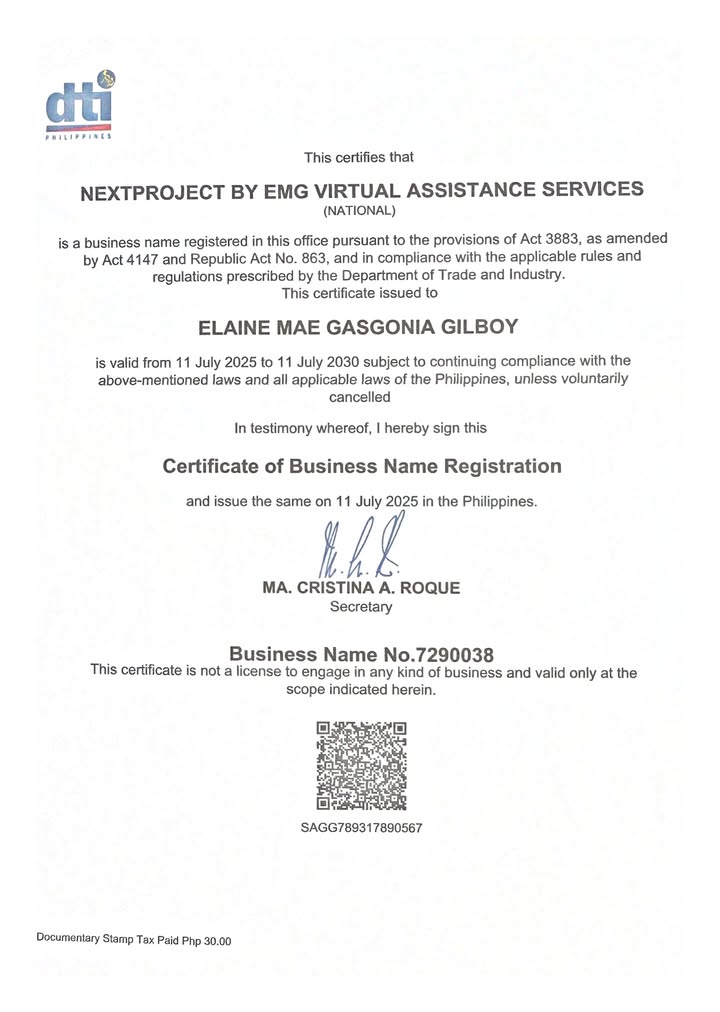 NEXTPROJECT BY EMG VIRTUAL ASSISTANCE SERVICES is a Philippine-based lead generation expert legally registered under DTI and BIR.